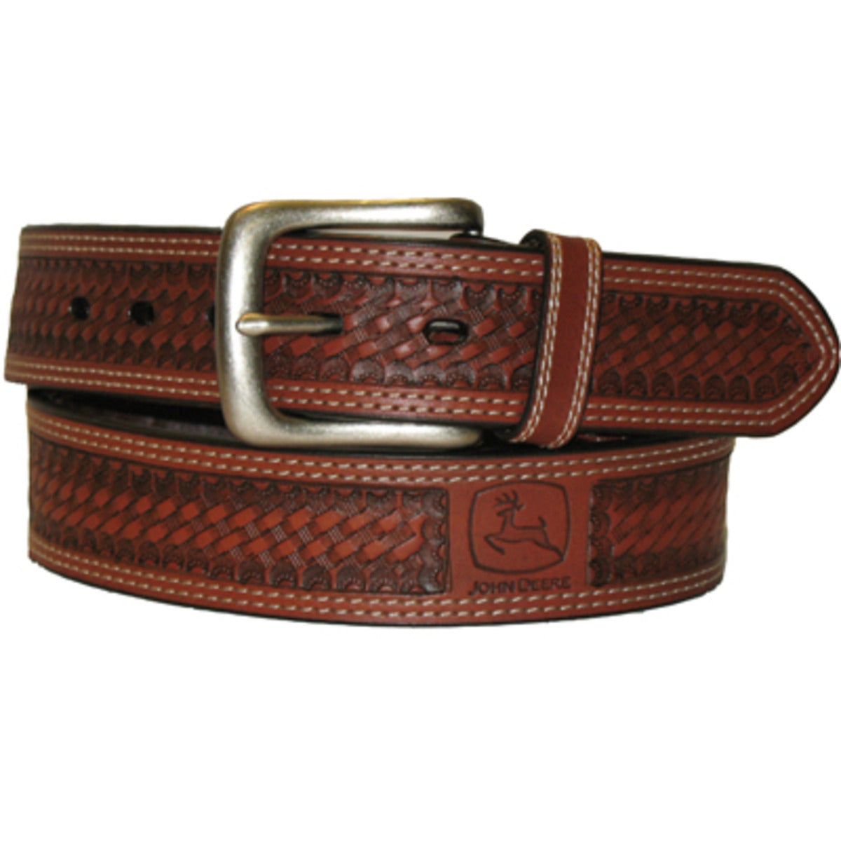Ceinture de travail en cuir pleine fleur de qualité supérieure, parfaite pour les amateurs de John Deere. Largeur de 1,5 pouce avec un motif de tissage en panier embossé et logo John Deere discret. Coutures doubles contrastantes pour une durabilité accrue et une boucle en nickel amovible pour plus de polyvalence. Disponible en teinte tan naturelle, tailles 32 à 46. Un accessoire robuste et intemporel qui complète tout ensemble de travail.